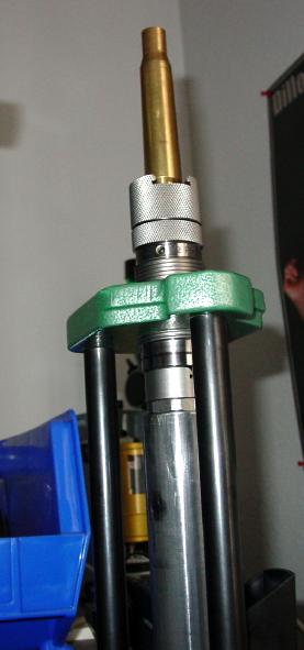 I set up my .50 full-length sizing die just as I would set up a smaller caliber; I run it down until it just kisses the shellholder, then back off exactly one skootch. (I'll cover neck sizing in the match prep section.) The only real difference here is that the shellholder on many .50 presses is threaded in, and can be adjusted up and down. It is also prone to coming loose if not fastened securely. I run it down as far as possible to avoid loosening it inadvertently. I do this before adjusting the die.