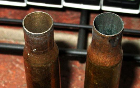 Now look inside the case necks. If they're government surplus, especially pulls, odds are there's an uneven coating of black 'crud'.