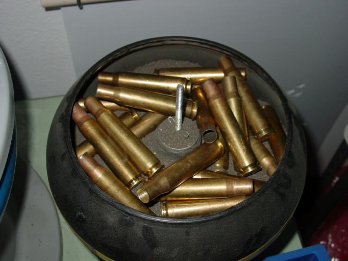 When the case necks are clean inside, it's time to polish the brass. Polishing is done in a tumbler, just like for smaller rounds, and you can use the very same tumbler. A small tumbler will usually handle about 25 cases. (Yep, that's all.)