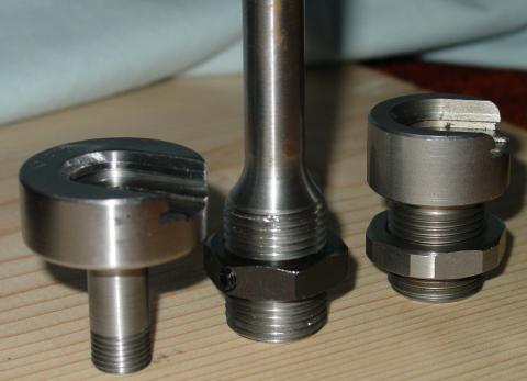 On the left is the modified shellholder, next is a bullet pusher which must also be changed, and the RCBS shellholder which will remain with my RCBS (Ammomaster) press. (The shank on the RCBS shellholder isn't long enough to extend through the bushing on the Hollywood press, so it couldn't be modified anyway.)