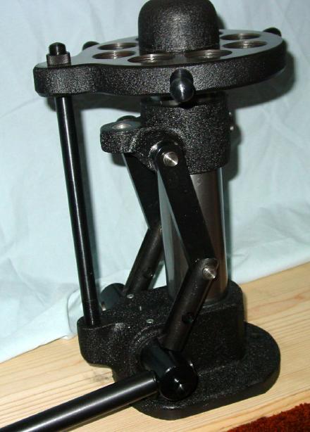 Here you have left and right views of the press. In the left view there is a vertical rod connecting the turret to the base. (Approximately behind the handle, but visible.) This rod is presumably to stiffen the press for full-length sizing operations, and can only be present when using the die in that particular spot. The rod must be removed, as in the left side view, to index the turret. (For descriptive purposes here, the handle side is the right side.) A sleeve carries the shellholder up the column to the head, where the dies are mounted. The press comes with exactly what is shown in the right side photo and nothing more. (Well, OK, maybe a catalog.)