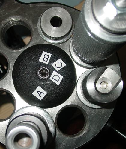 In the photo above, die 'A' will not even fit, as there is not enough room between the die hole and the turret hub to screw the lockring down. (Lockring is from CH4D)